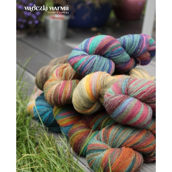Inga 6/1 is a 100% natural hand dyed wool yarns. The yarns are made in Latvia from the wool which is collected from the sheeps grown up in Latvia. The yarns are presented in the hanks. The weight of one hank is not exactly the same every time. The yarns are much harder than for example merino wool. But what our local experienced knitters say is that after each washing the garment becomes softer and softer. And the garments are usualy extreamly warm if they are made out from this yarn. The yarns are beautifuly dyed. They have long colour sections and transitions from one section to another section are very soft and beautiful. If the hank would be of 100g weight it would have around 500m. The yarn is quite thin, it is very suitable for the scarves, shawls.