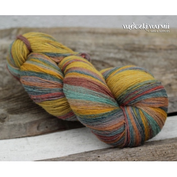 Inga 6/1 to naturalna organiczna 100% wełna, produkowana z przędzy wyłącznie z łotewskich owiec. Włóczka jest wolna od obróbki chemicznej, zawiera lanolinę, olej przędzalniczy jak i drobne źdźbła trawy. Włóczka jest ręcznie farbowana na melanż przenikających się kolorów - w gotowym wyrobie układa się w pasy delikatnie przenikających się odcieni: słonecznej żółci, pomarańczu, różu, błękitu, patyny, denimu i oliwkowej zieleni. Poszczególne kolory są farbowane w niewielkich partiach, więc układ barwny jest niepowtarzalny i unikatowy. Warto uwzględnić to w ilości kupowanej włóczki, gdyż dobranie identycznego odcienia może być niemożliwe. Nitka jest pojedyncza, lekko skręcona 6/1 ply, zawiera lanolinę. Nić jest nieco rustykalna i szorstka, lecz z każdym praniem nabiera miękkości. Włóczka nadaje się na wszelkie zimowe wyroby i chusty. Bardzo wydajny metraż - ok. 500 m w 100g. Wełna ta może "podgryzać" osoby o wrażliwej skórze. Włóczka zwinięta w precel, o nieregularnej wadze.