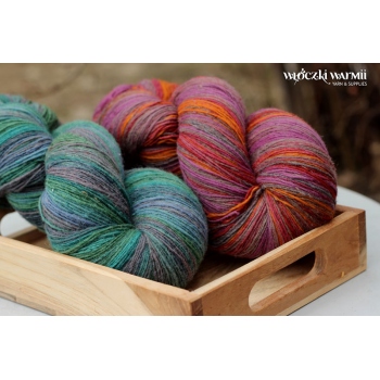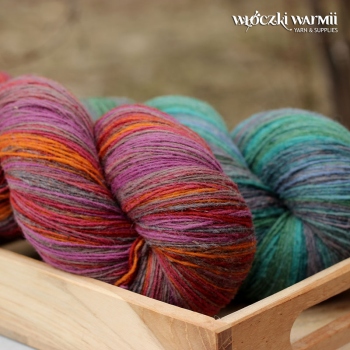 Inga 6/1 to naturalna organiczna 100% wełna, produkowana z przędzy wyłącznie z łotewskich owiec. Włóczka jest wolna od obróbki chemicznej, zawiera lanolinę, olej przędzalniczy jak i drobne źdźbła trawy. Włóczka jest ręcznie farbowana na melanż przenikających się kolorów - w gotowym wyrobie układa się w pasy delikatnie przenikających się odcieni: koralowej czerwieni, bordo, cynobru, pomarańczu, szarości i fioletu. Poszczególne kolory są farbowane w niewielkich partiach, wiec układ barwny jest niepowtarzalny i unikatowy. Warto uwzględnić to w ilości kupowanej włóczki, gdyż dobranie identycznego odcienia może być niemożliwe. Nitka jest pojedyncza, lekko skręcona 6/1 ply, zawiera lanolinę. Nić jest nieco rustykalna i szorstka, lecz z każdym praniem nabiera miękkości. Włóczka nadaje się na wszelkie zimowe wyroby i chusty. Bardzo wydajny metraż - ok. 500 m w 100g. Wełna ta może "podgryzać" osoby o wrażliwej skórze. Włóczka zwinięta w precel, o nieregularnej wadze.