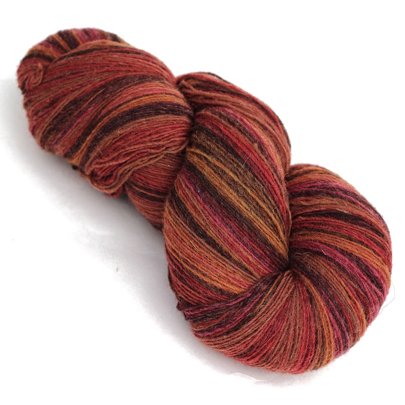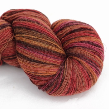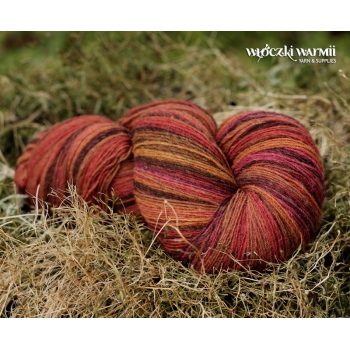 Inga 6/1 to naturalna orgniczna 100% wełna, produkowana z przędzy wyłącznie z łotewskich owiec. Włóczka jest wolna od obróbki chemicznej, zawiera lanolinę, olej przędzalniczy jak i drobne źdźbła trawy. Włóczka jest ręcznie farbowana na melanż przenikających się kolorów - w gotowym wyrobie układa się w pasy delikatnie przenikających się odcieni: rdzy, pomarańczu, karmelu, brązu, czerwieni, bordo. Poszczególne kolory są farbowane w niewielkich partiach, wiec układ barwny jest niepowtarzalny i unikatowy. Warto uwzględnić to w ilości kupowanej włóczki, gdyż dobranie identycznego odcienia może być niemożliwe. Nitka jest pojedyncza, lekko skręcona 6/1 ply, zawiera lanolinę. Nić jest nieco rustykalna i szorstka, lecz z każdym praniem nabiera miekkości. Włóczka nadaje się na wszelkie zimowe wyroby i chusty. Bardzo wydajny metraż - ok. 500 m w 100g. Wełna ta może "podgryzać" osoby o wrażliwej skórze. Włóczka zwinięta w precel, o nieregularnej wadze.