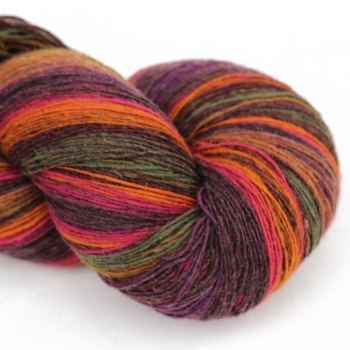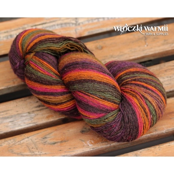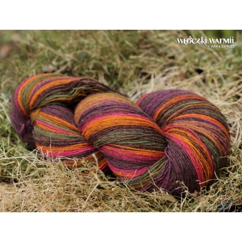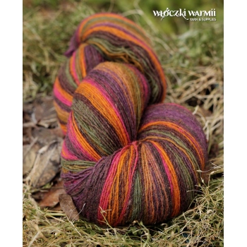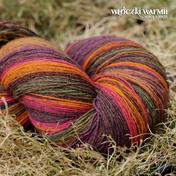 Inga 6/1 to naturalna organiczna 100% wełna, produkowana z przędzy wyłącznie z łotewskich owiec. Włóczka jest wolna od obróbki chemicznej, zawiera lanolinę, olej przędzalniczy jak i drobne źdźbła trawy. Włóczka jest ręcznie farbowana na melanż przenikających się kolorów - w gotowym wyrobie układa się w pasy delikatnie przenikających się odcieni: pomarańczu, cynamonu, czekoladowego brązu, oliwkowej zieleni, fioletu i fuksji. Poszczególne kolory są farbowane w niewielkich partiach, wiec układ barwny jest niepowtarzalny i unikatowy. Warto uwzględnić to w ilości kupowanej włóczki, gdyż dobranie identycznego odcienia może być niemożliwe. Nitka jest pojedyncza, lekko skręcona 6/1 ply, zawiera lanolinę. Nić jest nieco rustykalna i szorstka, lecz z każdym praniem nabiera miękkości. Włóczka nadaje się na wszelkie zimowe wyroby i chusty. Bardzo wydajny metraż - ok. 500 m w 100g. Wełna ta może "podgryzać" osoby o wrażliwej skórze. Włóczka zwinięta w precel, o nieregularnej wadze.