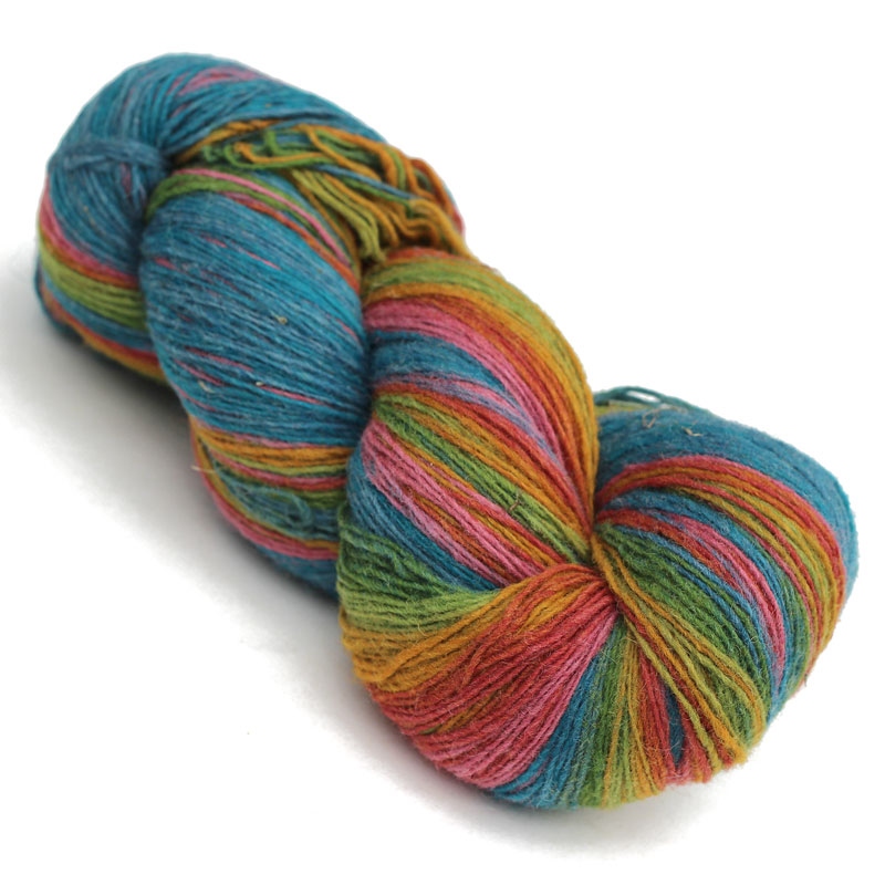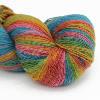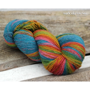 Inga 6/1 to naturalna organiczna 100% wełna, produkowana z przędzy wyłącznie z łotewskich owiec. Włóczka jest wolna od obróbki chemicznej, zawiera lanolinę, olej przędzalniczy jak i drobne źdźbła trawy. Włóczka jest farbowana na melanż przenikających się kolorów - w gotowym wyrobie układa się w pasy delikatnie przenikających się odcieni: żółci, pomarańczu, czerwieni, różu, zieleni i turkusu. Poszczególne kolory są farbowane w niewielkich partiach, wiec układ barwny jest niepowtarzalny i unikatowy. Warto uwzględnić to w ilości kupowanej włóczki, gdyż dobranie identycznego odcienia może być niemożliwe. Nitka jest pojedyncza, lekko skręcona 6/1 ply, zawiera lanolinę. Nić jest nieco rustykalna i szorstka, lecz z każdym praniem nabiera miekkości. Włóczka nadaje się na wszelkie zimowe wyroby i chusty. Bardzo wydajny metraż - ok. 500 m w 100g. Wełna ta może "podgryzać" osoby o wrażliwej skórze. Włóczka zwinięta w precel, o nieregularnej wadze.