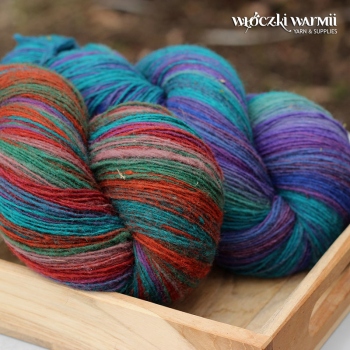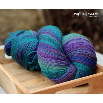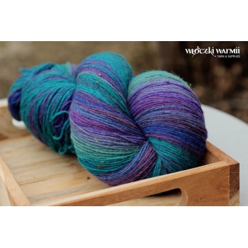 Inga 6/1 to naturalna orgniczna 100% wełna, produkowana z przędzy wyłącznie z łotewskich owiec. Włóczka jest wolna od obróbki chemicznej, zawiera lanolinę, olej przędzalniczy jak i drobne źdźbła trawy. Włóczka jest ręcznie farbowana na melanż przenikających się kolorów - w gotowym wyrobie układa się w pasy delikatnie przenikających się odcieni: mięty, turkusu, fioletu, kobaltu, ultramaryny i granatu. Poszczególne kolory są farbowane w niewielkich partiach, wiec układ barwny jest niepowtarzalny i unikatowy. Warto uwzględnić to w ilości kupowanej włóczki, gdyż dobranie identycznego odcienia może być niemożliwe. Nitka jest pojedyncza, lekko skręcona 6/1 ply, zawiera lanolinę. Nić jest nieco rustykalna i szorstka, lecz z każdym praniem nabiera miekkości. Włóczka nadaje się na wszelkie zimowe wyroby i chusty. Bardzo wydajny metraż - ok. 500 m w 100g. Wełna ta może "podgryzać" osoby o wrażliwej skórze. Włóczka zwinięta w precel, o nieregularnej wadze.