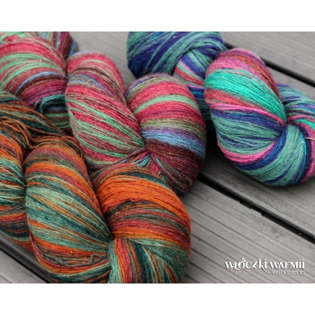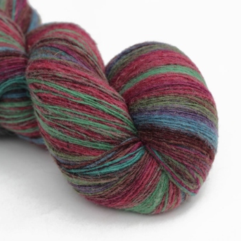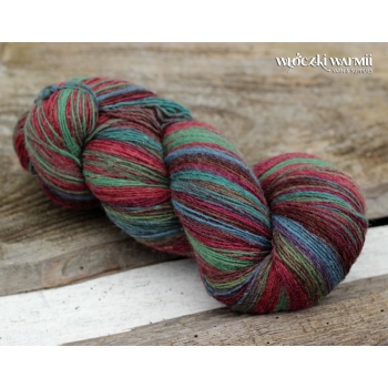 Inga 6/1 to naturalna organiczna 100% wełna, produkowana z przędzy wyłącznie z łotewskich owiec. Włóczka jest wolna od obróbki chemicznej, zawiera lanolinę, olej przędzalniczy jak i drobne źdźbła trawy. Włóczka jest ręcznie farbowana na melanż przenikających się kolorów - w gotowym wyrobie układa się w pasy delikatnie przenikających się odcieni: karminu, kasztanowego, burgundu, oliwkowej zieleni, mięty, niebieskiego i fioletu. Poszczególne kolory są farbowane w niewielkich partiach, wiec układ barwny jest niepowtarzalny i unikatowy. Warto uwzględnić to w ilości kupowanej włóczki, gdyż dobranie identycznego odcienia może być niemożliwe. Nitka jest pojedyncza, lekko skręcona 6/1 ply, zawiera lanolinę. Nić jest nieco rustykalna i szorstka, lecz z każdym praniem nabiera miękkości. Włóczka nadaje się na wszelkie zimowe wyroby i chusty. Bardzo wydajny metraż - ok. 500 m w 100g. Wełna ta może "podgryzać" osoby o wrażliwej skórze. Włóczka zwinięta w precel, o nieregularnej wadze.