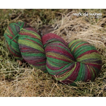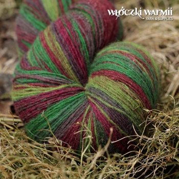 Inga 6/1 to naturalna orgniczna 100% wełna, produkowana z przędzy wyłącznie z łotewskich owiec. Włóczka jest wolna od obróbki chemicznej, zawiera lanolinę, olej przędzalniczy jak i drobne źdźbła trawy. Włóczka jest ręcznie farbowana na melanż przenikających się kolorów - w gotowym wyrobie układa się w pasy delikatnie przenikających się odcieni: świerkowa zieleń, oberżyna, fiolet, limonka. Poszczególne kolory są farbowane w niewielkich partiach, więc układ barwny jest niepowtarzalny i unikatowy. Warto uwzględnić to w ilości kupowanej włóczki, gdyż dobranie identycznego odcienia może być niemożliwe. Nitka jest pojedyncza, lekko skręcona 6/1 ply, zawiera lanolinę. Nić jest nieco rustykalna i szorstka, lecz z każdym praniem nabiera miekkości. Włóczka nadaje się na wszelkie zimowe wyroby i chusty. Bardzo wydajny metraż - ok. 500 m w 100g. Wełna ta może "podgryzać" osoby o wrażliwej skórze. Włóczka zwinięta w precel, o nieregularnej wadze.
