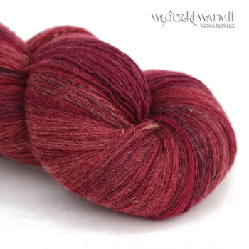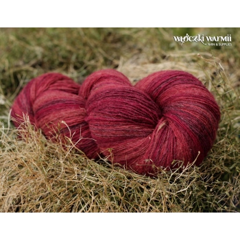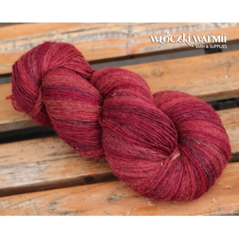 Inga 6/1 to naturalna organiczna 100% wełna, produkowana z przędzy wyłącznie z łotewskich owiec. Włóczka jest wolna od obróbki chemicznej, zawiera lanolinę, olej przędzalniczy jak i drobne źdźbła trawy. Włóczka jest farbowana na melanż przenikających się kolorów - w gotowym wyrobie układa się w pasy delikatnie przenikających się odcieni: czerwieni, bordo, karminu. Poszczególne kolory są farbowane w niewielkich partiach, więc układ barwny jest niepowtarzalny i unikatowy. Warto uwzględnić to w ilości kupowanej włóczki, gdyż dobranie identycznego odcienia może być niemożliwe. Nitka jest pojedyncza, lekko skręcona 6/1 ply, zawiera lanolinę. Nić jest nieco rustykalna i szorstka, lecz z każdym praniem nabiera miękkości. Włóczka nadaje się na wszelkie zimowe wyroby i chusty. Bardzo wydajny metraż - ok. 500 m w 100g. Wełna ta może "podgryzać" osoby o wrażliwej skórze. Włóczka zwinięta w precel, o nieregularnej wadze.