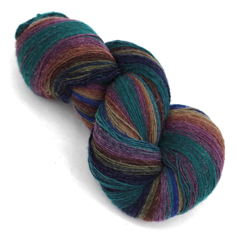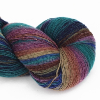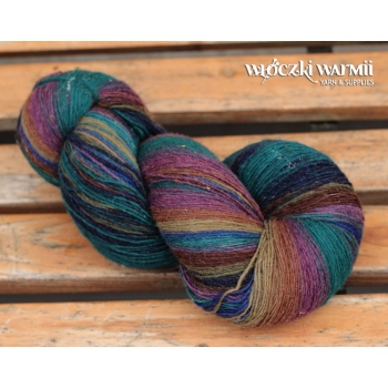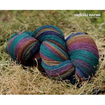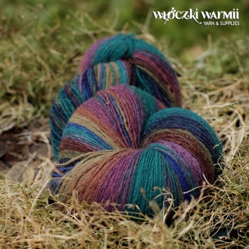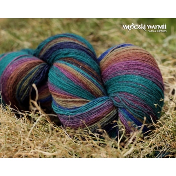 Inga 6/1 to naturalna organiczna 100% wełna, produkowana z przędzy wyłącznie z łotewskich owiec. Włóczka jest wolna od obróbki chemicznej, zawiera lanolinę, olej przędzalniczy jak i drobne źdźbła trawy. Włóczka jest ręcznie farbowana na melanż przenikających się kolorów - w gotowym wyrobie układa się w pasy delikatnie przenikających się odcieni: petrolu, granatu, fioletu, śliwki, brązu i khaki. Poszczególne kolory są farbowane w niewielkich partiach, wiec układ barwny jest niepowtarzalny i unikatowy. Warto uwzględnić to w ilości kupowanej włóczki, gdyż dobranie identycznego odcienia może być niemożliwe. Nitka jest pojedyncza, lekko skręcona 6/1 ply, zawiera lanolinę. Nić jest nieco rustykalna i szorstka, lecz z każdym praniem nabiera miękkości. Włóczka nadaje się na wszelkie zimowe wyroby i chusty. Bardzo wydajny metraż - ok. 500 m w 100g. Wełna ta może "podgryzać" osoby o wrażliwej skórze. Włóczka zwinięta w precel, o nieregularnej wadze.