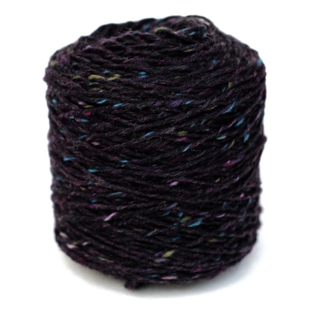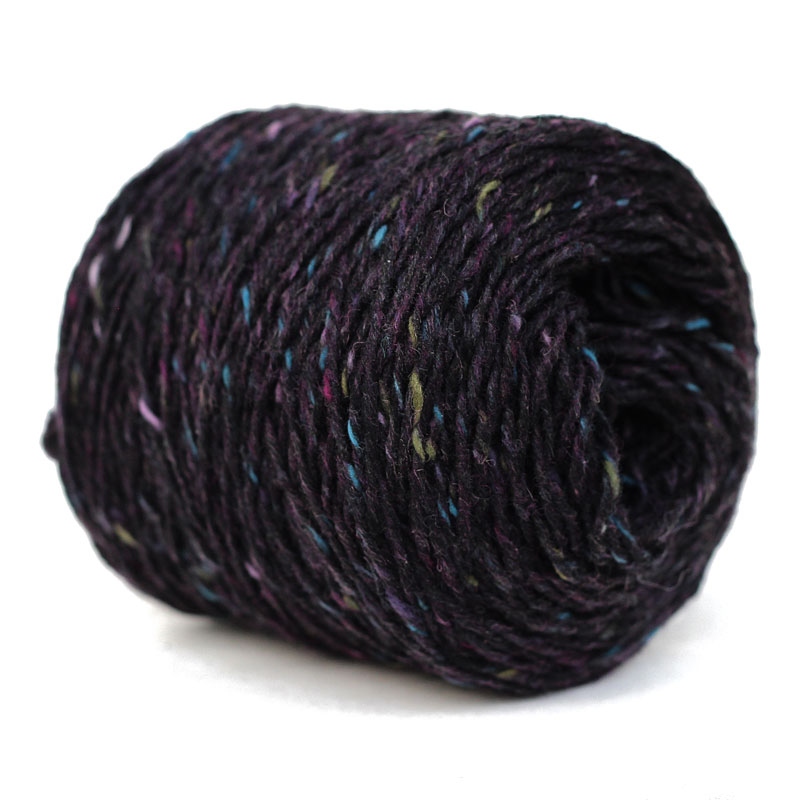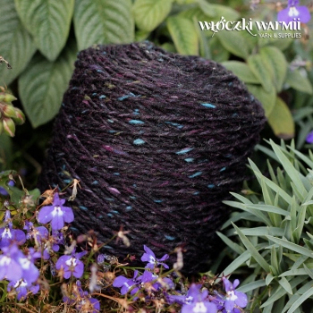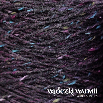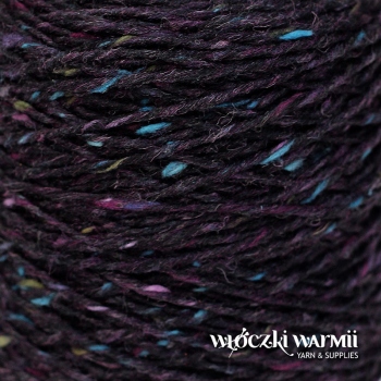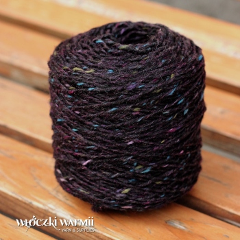 KILCARRA TWEED to wełniana przędza grubości Aran od tradycyjnego producenta tweedu Donegal Yarns. Włóczka to 100% czysta wełna (Pure New Wool) składająca się z 57% wełny nowozelandzkiej, 27% norweskiej i 16% z wełny produkcji europejskiej. Jest to włóczka typu tweed produkcji irlandzkiej w postaci pojedynczej nitki (1 ply) poprzetykanej kolorowymi drobinkami, przędziona tak by przypominała tradycyjną przędzę wykonywaną w domu. Kolory w motku to: bakłażanowy z turkusowo-różowo-pistacjowymi niupkami. Włóczka pokryta jest olejem przędzalniczym, więc w robótce sprawia wrażenie "sznurkowatej i sztywnej". Gotową robótkę należy namoczyć w ciepłej wodzie z detergentem, a następnie delikatnie uprać, wypłukać, odcisnąć nadmiar wody i suszyć na płasko. Po takim zabiegu nitka pęcznieje, nabiera puszystości i z każdym praniem staje się bardziej miękka. Może podgryzać osoby wrażliwe. Ważne jest, aby przed rozpoczęciem pracy tak samo potraktować próbkę - co pozwoli nam na wiarygodną ocenę ilości oczek oraz odpowiedni dobór grubości drutów. Po praniu włóczka jest miękka w dotyku i ciepła, a kolory nieco jaśniejsze. Nitkę należy przerabiać na grubszych drutach: 5-6, gdyż dzianina po praniu puchnie, zwykle nieco rozszerza się, a kurczy na długość. Przeznaczona na jesienno-zimowe chusty, szale, akcesoria, swetry.
