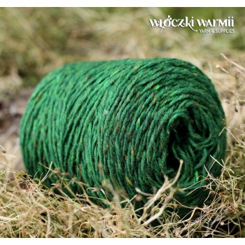 KILCARRA TWEED to wełniana przędza grubości Aran od tradycyjnego producenta tweedu Donegal Yarns. Włóczka to 100% czysta wełna (Pure New Wool) składająca się z 57% wełny nowozelandzkiej, 27% norweskiej i 16% z wełny produkcji europejskiej. Jest to włóczka typu tweed produkcji irlandzkiej w postaci pojedynczej nitki (1 ply) poprzetykanej kolorowymi drobinkami, przędziona tak by przypominała tradycyjną przędzę wykonywaną w domu. Kolory w motku to: soczysta zieleń z oliwkowo-limonkowymi niupkami. Włóczka pokryta jest olejem przędzalniczym, więc w robótce sprawia wrażenie "sznurkowatej i sztywnej". Gotową robótkę należy namoczyć w ciepłej wodzie z detergentem, a następnie delikatnie uprać, wypłukać, odcisnąć nadmiar wody i suszyć na płasko. Po takim zabiegu nitka pęcznieje, nabiera puszystości i z każdym praniem staje się bardziej miękka. Może podgryzać osoby wrażliwe. Ważne jest, aby przed rozpoczęciem pracy tak samo potraktować próbkę - co pozwoli nam na wiarygodną ocenę ilości oczek oraz odpowiedni dobór grubości drutów. Po praniu włóczka jest miękka w dotyku i ciepła, a kolory nieco jaśniejsze. Nitkę należy przerabiać na grubszych drutach: 5-6, gdyż dzianina po praniu puchnie, zwykle nieco rozszerza się, a kurczy na długość. Przeznaczona na jesienno-zimowe chusty, szale, akcesoria, swetry.