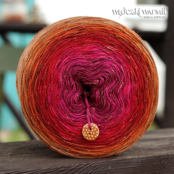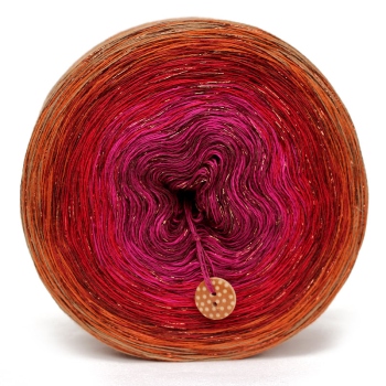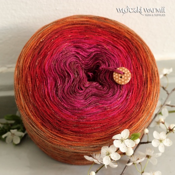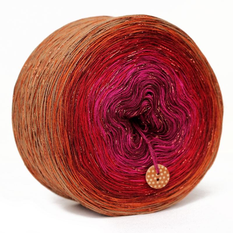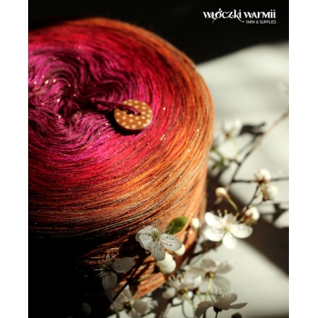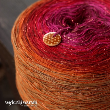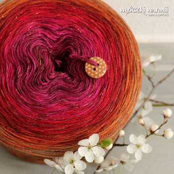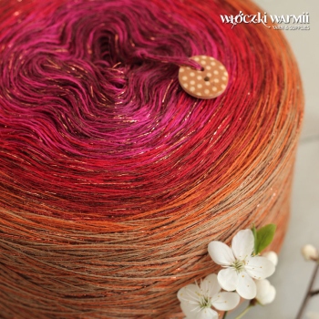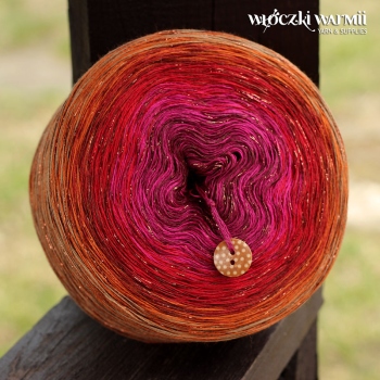 Kolory w motku: malinowy, fuksja, czerwień, cegła, pomarańcz, nugat + dodatkowa brązowa nitka z miedzianym lurexem