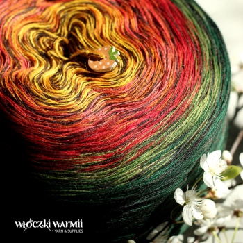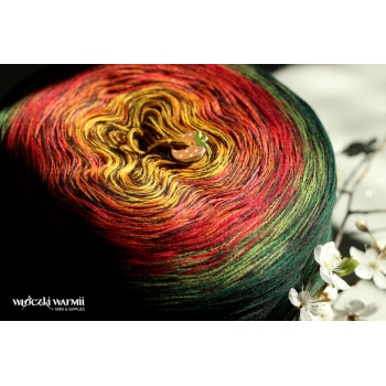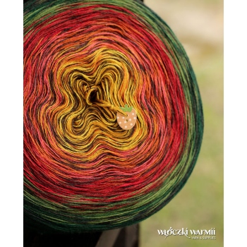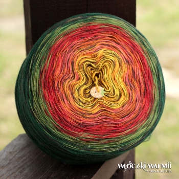 Kolory w motku:  żółty, musztarda, koral, pomarańcz, czerwień, cegłą, wiosenna zieleń, leśna zieleń, ciemna zieleń + dodatkowa wełniana ciemnobrązowa nitka