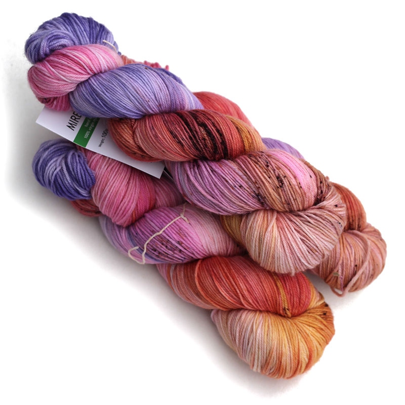 MIRELLA to ręcznie farbowana 100% jagnięca wełna merynosowa (100% virgin merino wool). Cienka, lecz wytrzymała włóczka jest niezwykle miła, miękka i sprężysta w dotyku. Kolory w motku to: pastelowe fiolety, róże, koralowy, pomarańcz cętkowany brązem. Nadaje się na wszelkie całoroczne wyroby, swetry, jak i chusty, szale, delikatne dodatki. Doskonała dla dzieci. Włóczka produkcji włoskiej. Ze względu na ręczne farbowane poszczególne motki mogą nieznacznie różnić się od siebie wybarwieniem i ilością odcieni. Aby zniwelować różnice w gotowym wyrobie zalecamy naprzemienne przerabianie nitki z 2 motków na raz.