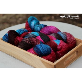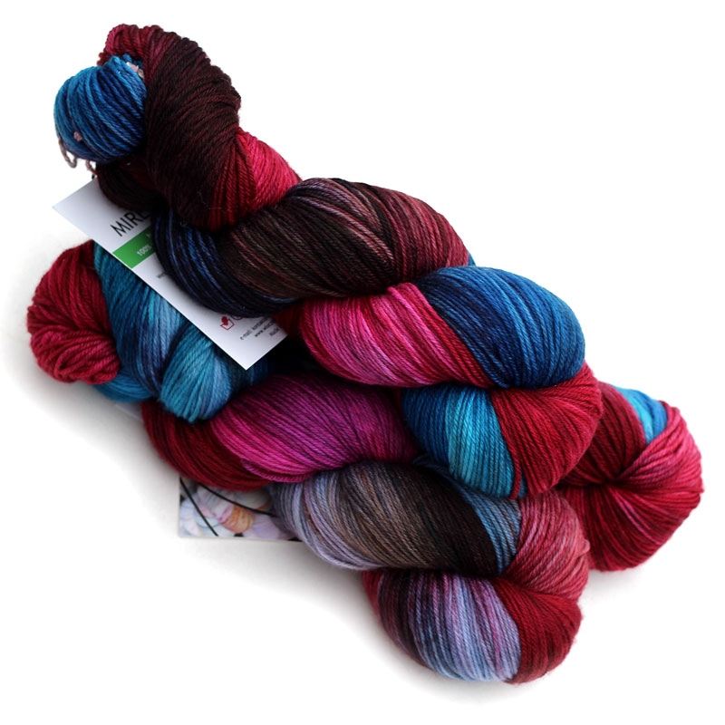 MIRELLA to ręcznie farbowana 100% jagnięca wełna merynosowa (100% virgin merino wool). Cienka, lecz wytrzymała włóczka jest niezwykle miła, miękka i sprężysta w dotyku. Kolory w motku to: fuksja, bordo, brąz, ciemny granat, turkus. Nadaje się na wszelkie całoroczne wyroby, swetry, jak i chusty, szale, delikatne dodatki. Doskonała dla dzieci. Włóczka produkcji włoskiej. Ze względu na ręczne farbowane poszczególne motki mogą nieznacznie różnić się od siebie wybarwieniem i ilością odcieni. Aby zniwelować różnice w gotowym wyrobie zalecamy naprzemienne przerabianie nitki z 2 motków na raz.
