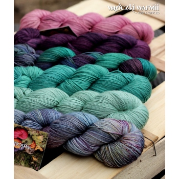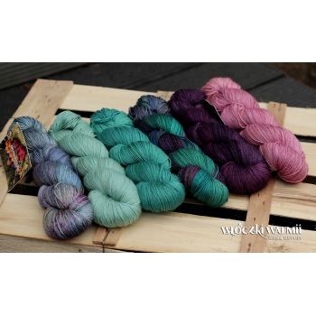 SELENA 4ply to ręcznie farbowana luksusowa mieszanka wełny merino ultrafine superwash (75%) i jedwabiu morwowego (25%). Włóczka grubości fingering, jest niezwykle miła i miękka w dotyku, o pięknym jedwabnym połysku, absolutnie niegryząca - można z niej wykonać wyroby noszone blisko ciała. Kolory w motku to: melanż mszystej zieleni, szmaragd, khaki, granat, niebieski, fiolet. To luksusowe włókno nadaje się przede wszystkim na delikatne sweterki, sukienki tuniki, jak i nieco grubsze chusty i szale. Ze względu na ręczne farbowanie poszczególne motki mogą nieznacznie różnić się od siebie wybarwieniem i ilością odcieni. Aby zniwelować różnice w gotowym wyrobie zalecamy naprzemienne przerabianie nitki z 2 motków na raz.