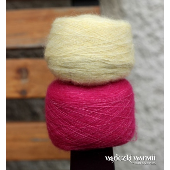SURI ALPAKA MOHER to włóczka typu lace w formie cieniutkiego moherku, wykonana z suri alpaki z dodatkiem wełny i poliamidu (53%, 14%, 33%). Włóczka bardzo dobrej jakości produkcji włoskiej, miękka i delikatna dla skóry. Kolor intensywny różowy na białej nitce daje efekt melanżu w typie "Stonewash". Włosek w nitce jest niewielki i bardzo miły, niegryzący w porównaniu do moheru wykonanego z włosa kóz, a dodatek poliamidu sprawia, że nitka jest mocna. Idealna do dziergania delikatnych chust, szali lub jako dodatkowa nitka do innej włóczki. W połączeniu z Mirellą lub Baby Supremo uzyskamy bardzo luksusową i miękką dzianinę. Bardzo wydajna - w 25g moteczku mamy aż 375 m. Przeznaczona na całoroczne wyroby. Włóczka wyprodukowana we Włoszech, certyfikowana przez A.I.A (Asociacion International de la Alpaca).