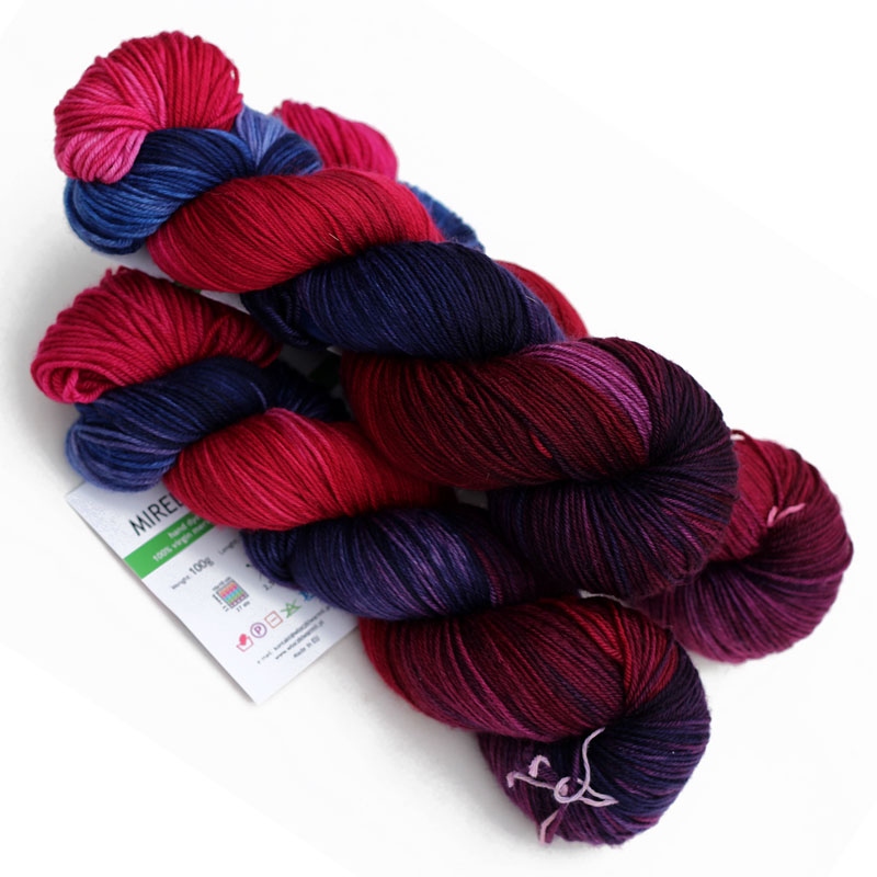 MIRELLA to ręcznie farbowana 100% jagnięca wełna merynosowa (100% virgin merino wool). Cienka, lecz wytrzymała włóczka jest niezwykle miła, miękka i sprężysta w dotyku. Kolory w motku to: melanż szafiru, granatu, fioletu, bordo i burgundu. Nadaje się na wszelkie całoroczne wyroby, swetry, jak i chusty, szale, delikatne dodatki. Doskonała dla dzieci. Włóczka produkcji włoskiej. Ze względu na ręczne farbowane poszczególne motki mogą nieznacznie różnić się od siebie wybarwieniem i ilością odcieni. Aby zniwelować różnice w gotowym wyrobie zalecamy naprzemienne przerabianie nitki z 2 motków na raz.