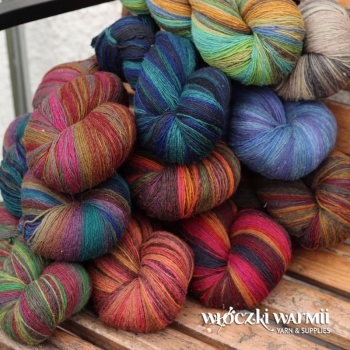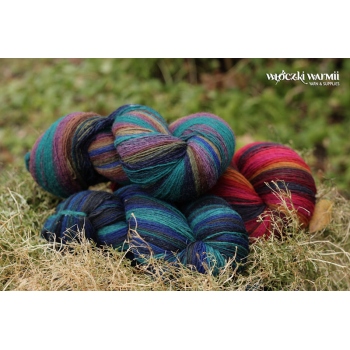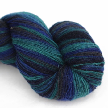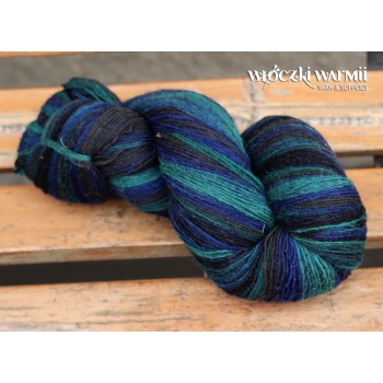 Inga 6/1 to naturalna orgniczna 100% wełna, produkowana z przędzy wyłącznie z łotewskich owiec. Włóczka jest wolna od obróbki chemicznej, zawiera lanolinę, olej przędzalniczy jak i drobne źdźbła trawy. Włóczka jest ręcznie farbowana na melanż przenikających się kolorów - w gotowym wyrobie układa się w pasy delikatnie przenikających się odcieni: szmaragdu, ciemnej zieleni, ultarmaryny, granatu i czerni. Poszczególne kolory są farbowane w niewielkich partiach, wiec układ barwny jest niepowtarzalny i unikatowy. Warto uwzględnić to w ilości kupowanej włóczki, gdyż dobranie identycznego odcienia może być niemożliwe. Nitka jest pojedyncza, lekko skręcona 6/1 ply, zawiera lanolinę. Nić jest nieco rustykalna i szorstka, lecz z każdym praniem nabiera miekkości. Włóczka nadaje się na wszelkie zimowe wyroby i chusty. Bardzo wydajny metraż - ok. 500 m w 100g. Wełna ta może "podgryzać" osoby o wrażliwej skórze. Włóczka zwinięta w precel, o nieregularnej wadze.