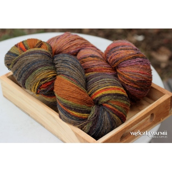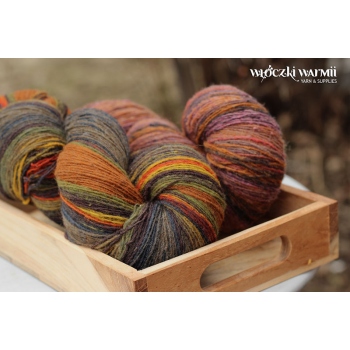 Inga 6/1 to naturalna orgniczna 100% wełna, produkowana z przędzy wyłącznie z łotewskich owiec. Włóczka jest wolna od obróbki chemicznej, zawiera lanolinę, olej przędzalniczy jak i drobne źdźbła trawy. Włóczka jest ręcznie farbowana na melanż przenikających się kolorów - w gotowym wyrobie układa się w pasy delikatnie przenikających się odcieni: pomarańczu, rudości, kasztanowego brązu, granatu, zieleni, oliwki, brązu, żółci. Poszczególne kolory są farbowane w niewielkich partiach, wiec układ barwny jest niepowtarzalny i unikatowy. Warto uwzględnić to w ilości kupowanej włóczki, gdyż dobranie identycznego odcienia może być niemożliwe. Nitka jest pojedyncza, lekko skręcona 6/1 ply, zawiera lanolinę. Nić jest nieco rustykalna i szorstka, lecz z każdym praniem nabiera miekkości. Włóczka nadaje się na wszelkie zimowe wyroby i chusty. Bardzo wydajny metraż - ok. 500 m w 100g. Wełna ta może "podgryzać" osoby o wrażliwej skórze. Włóczka zwinięta w precel, o nieregularnej wadze.