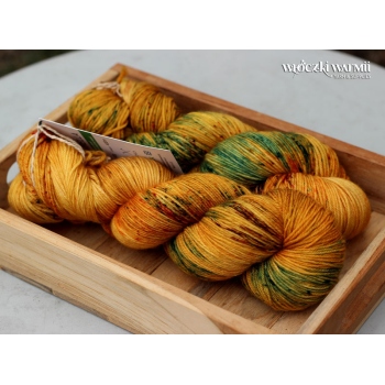 MIRELLA to ręcznie farbowana 100% jagnięca wełna merynosowa (100% virgin merino wool). Cienka, lecz wytrzymała włóczka jest niezwykle miła, miękka i sprężysta w dotyku. Kolory w motku to: miodowy cętkowany rudością, pomarańczem, czerwienią i ciemną zielenią, brązem. Nadaje się na wszelkie całoroczne wyroby, swetry, jak i chusty, szale, delikatne dodatki. Doskonała dla dzieci. Włóczka produkcji włoskiej. Ze względu na ręczne farbowane poszczególne motki mogą nieznacznie różnić się od siebie wybarwieniem i ilością odcieni. Aby zniwelować różnice w gotowym wyrobie zalecamy naprzemienne przerabianie nitki z 2 motków na raz.
