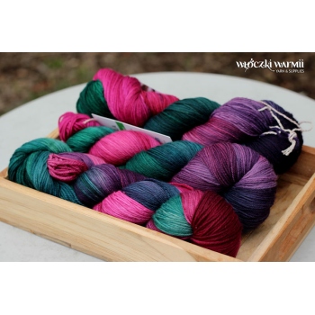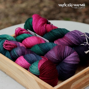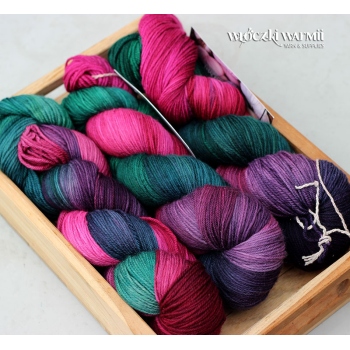 MIRELLA to ręcznie farbowana 100% jagnięca wełna merynosowa (100% virgin merino wool). Cienka, lecz wytrzymała włóczka jest niezwykle miła, miękka i sprężysta w dotyku. Kolory w motku to: fuksja, wiśniowe bordo, granat, fiolet i szmaragdowa ciemna zieleń. Nadaje się na wszelkie całoroczne wyroby, swetry, jak i chusty, szale, delikatne dodatki. Doskonała dla dzieci. Włóczka produkcji włoskiej. Ze względu na ręczne farbowane poszczególne motki mogą nieznacznie różnić się od siebie wybarwieniem i ilością odcieni. Aby zniwelować różnice w gotowym wyrobie zalecamy naprzemienne przerabianie nitki z 2 motków na raz.